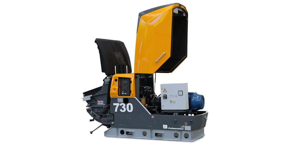 La pompa a pistone P 730 è ideale per il trasporto di calcestruzzo fine, fino ad una granulometria di 32 mm e per la lavorazione del calcestruzzo proiettato.